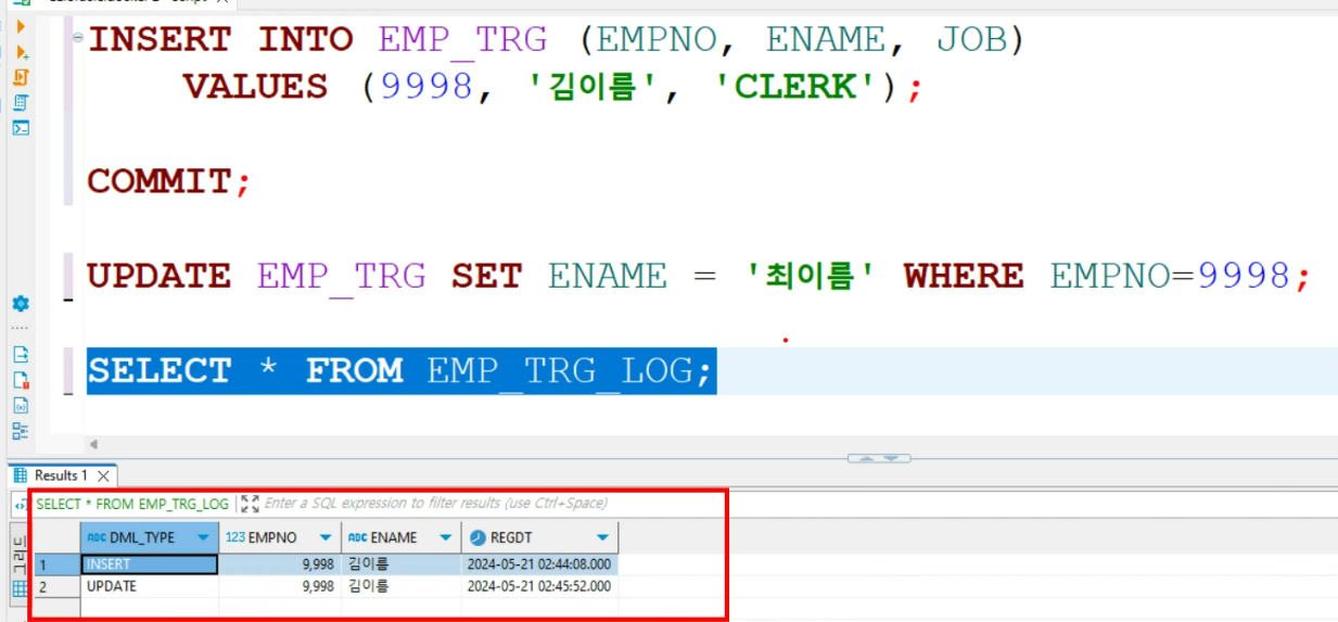 2) EMP_TRG_LOG 테이블에 EMP_TRG 테이블 데이터 변경 사항을 기록하는 트리거를 생성