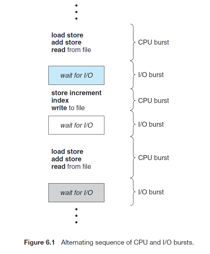 프로세스 실행은 CPU 실행 (CPU 버스트) 과 I/O 대기 (I/O 버스트)로 이루어짐. CPU 버스트 뒤에 I/O 버스트가 옴.