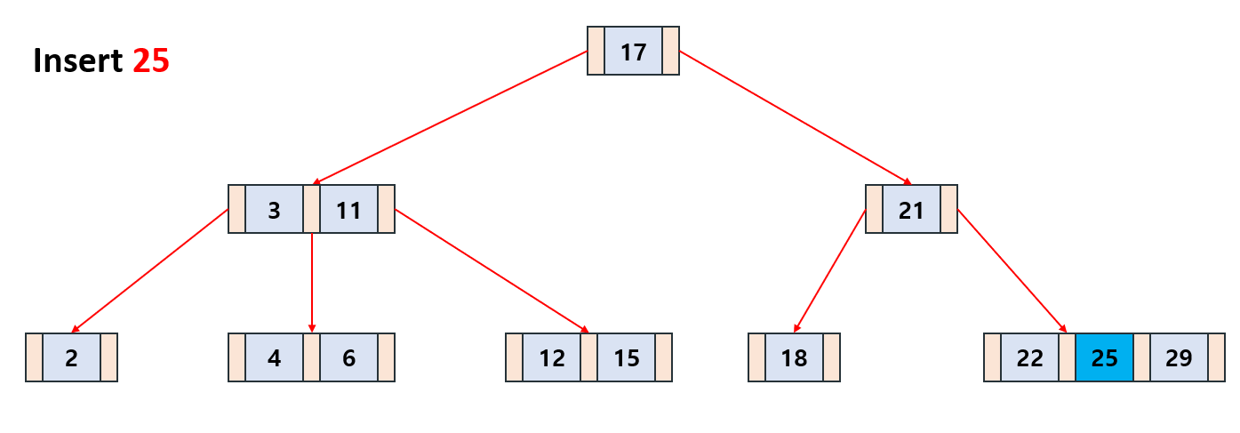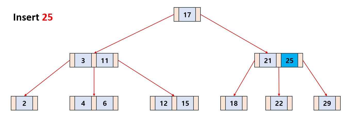 새로운 key 삽입은 leaf 노드에서 이루어짐. 해당 노드의 key 수가 M을 넘어간다면, 분할하는 과정이 이루어짐.