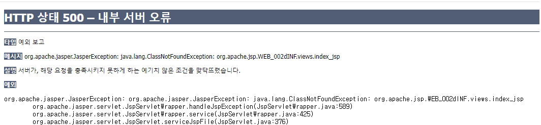 ClassNotFoundException: org.apache.jsp.WEB_002dINF.views.index_jsp: JSP 파일이 서블릿으로 컴파일된 후 생성된 클래스 파일을 찾지 못했음을 나타냄. 이는 JSP 파일의 컴파일이 실패했거나, 해당 파일이 예상된 위치에 존재하지 않는다는 것을 의미.