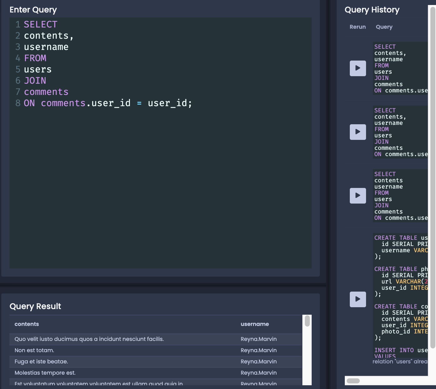 데이터 set 으로부터 모든 comment 의 contents 와 각 comment 를 작성한 user 의 username 을 찾아오는 쿼리를 작성해주세요. 힌트) JOIN
