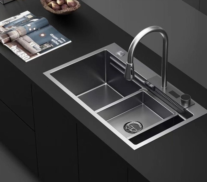 Additionally, the surface not only adds an element of sophistication but also enhances the stainless steel sink's resistance to scratches and stains, ensuring longevity and minimal maintenance. Elevate your kitchen with a sink with cup washer and waterfall that combines contemporary style with versatile performance.