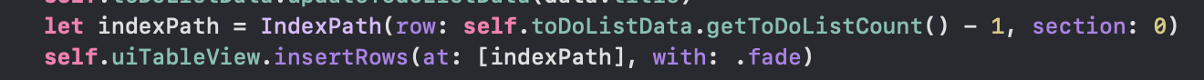 insertRows는 인자값으로 IndexPath와 RowAnimation을 받기 때문에, indexPath와 RowAnimation중에 하나인 .fade값을 넣어 줬다.