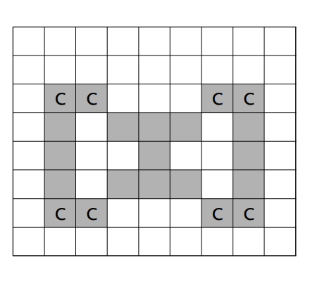 N×M의 모눈종이 위에 아주 얇은 치즈가 <그림 1>과 같이 표시되어 있다. 단, N 은 세로 격자의 수이고, M 은 가로 격자의 수이다. 이 치즈는 냉동 보관을 해야만 하는데 실내온도에 내어놓으면 공기와 접촉하여 천천히 녹는다. 그런데 이러한 모눈종이 모양의 치즈에서 각 치즈 격자(작 은 정사각형 모양)의 4변 중에서 적어도 2변 이상이 실내온도의 공기와 접촉한 것은 정확히 한시간만에 녹아 없어져 버린다. 따라서 아래 <그림 1> 모양과 같은 치즈(회색으로 표시된 부분)라면 C로 표시된 모든 치즈 격자는 한 시간 후에 사라진다.