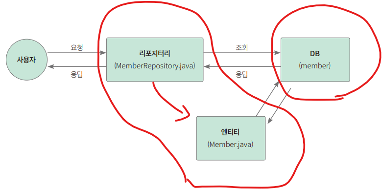1) 레포지토리는 엔티티 매핑정보(DB를 자바객체로 표현)를 바탕으로 DB에 쿼리를 보낸다.