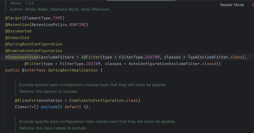 @SpringBootApplication 어노테이션의 구성을 자세히 살펴보자.