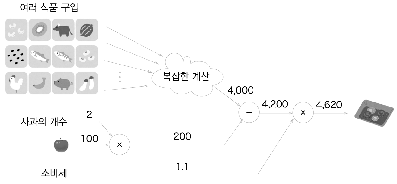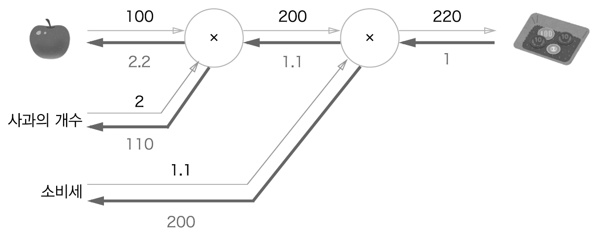 위의 문제1에서 사과 가격이 오르면 최종 금액에 어떤 영향을 끼치는지 알고 싶다는 것은 "사과 가격에 대한 지불 금액의 미분"을 구하는 것과 같다. 이는 역전파를 통해 구할 수 있다.