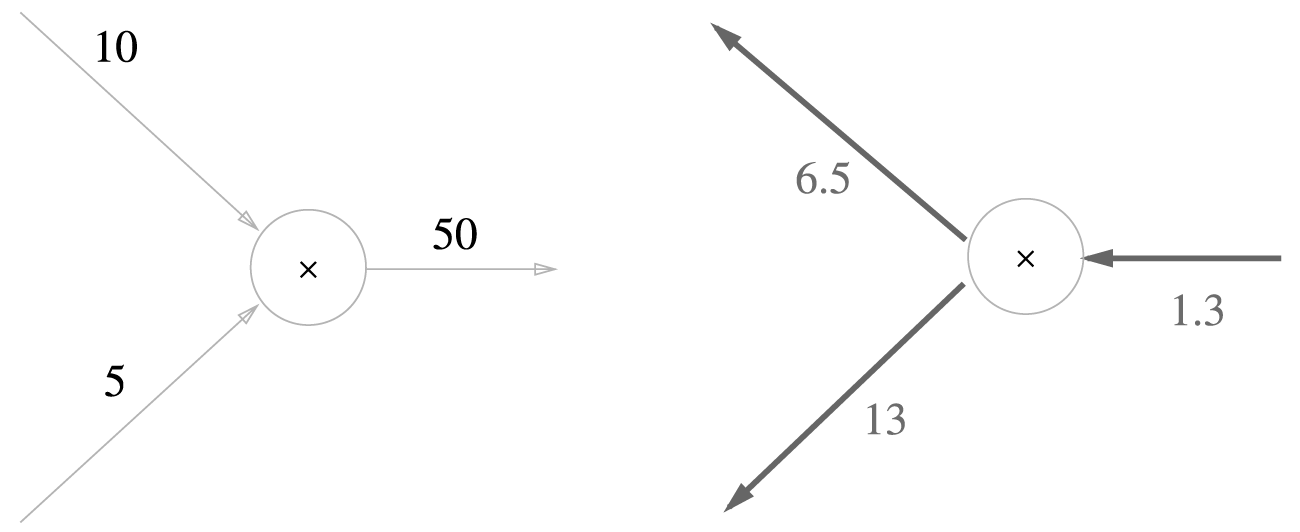 따라서 곱셈은 역전파 때 에 입력 신호들을 "서로 바꾼값"을 곱하여 흘린다.