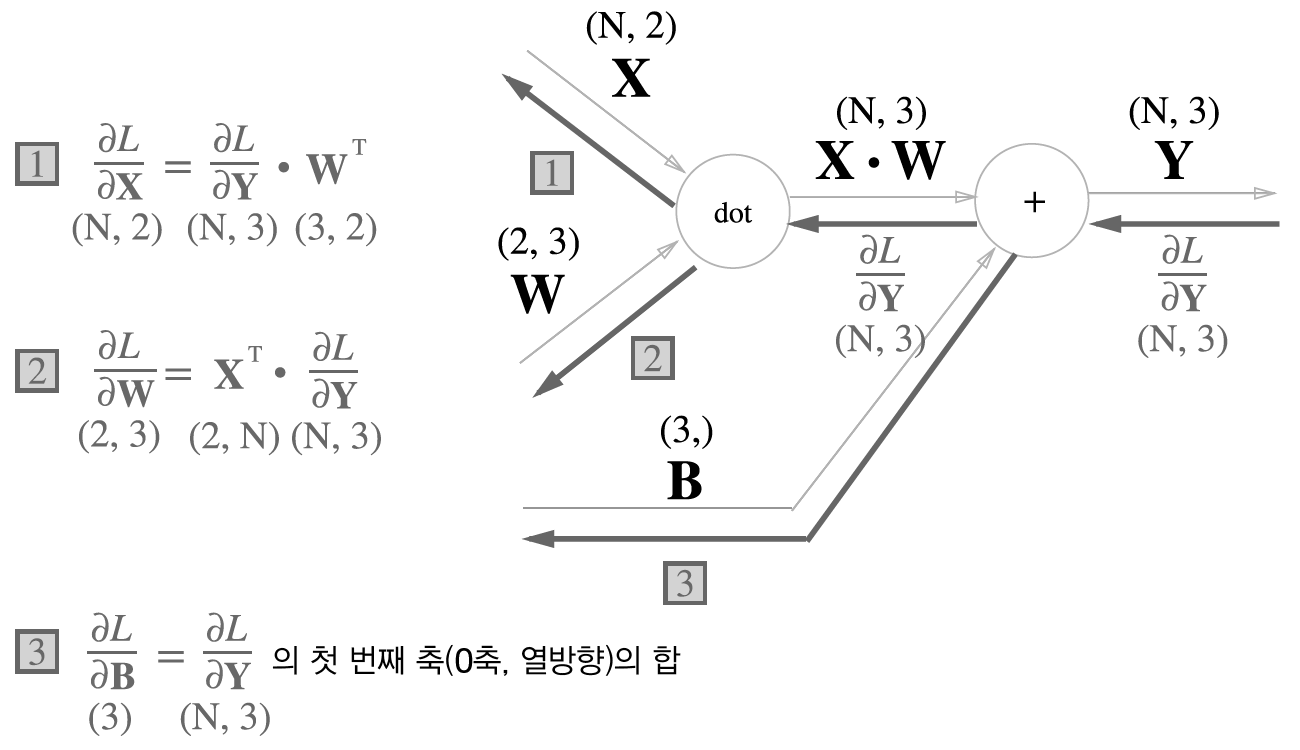 이를 코드로 나타내면dY = np.array([[1,2,3], [4,5,6]]) dB = np.sum(dY, axis=0)