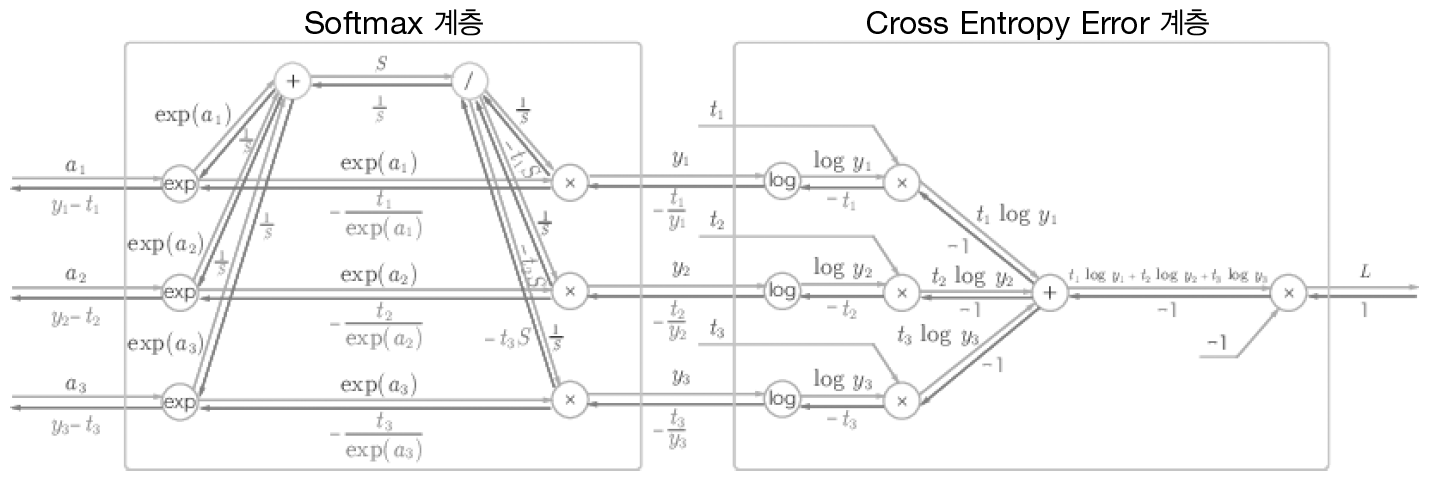 실제 구현시 손실함수(교차 엔트로피 오차)도 포함하여 Softmax-with-Loss 계층을 구현한다.
