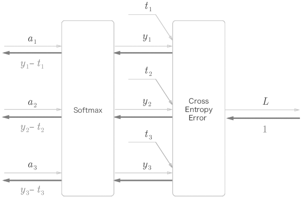 예를들어 정답레이블이 (0, 1, 0)일떄 Softmax 계층이 (0.3, 0.2, 0.5)를 출력했다고 가정한다. 현재 출력에서는 정답의 확률이 0.2밖에 안되어 신경망은 제대로 인식을 못하고 있다. 이 경우 역전파는(0.3, -0.8, 0.5)라는 커다란 오차를 전파한다.