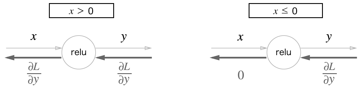 순전파 때의 입력인 x가 0보다 크면 역전파는 그대로 흘린다.