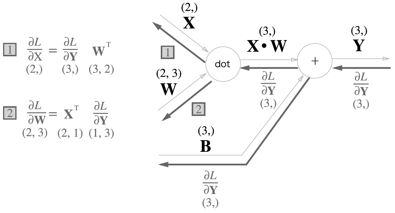 순전파때의 값을 바꾼 전치행렬을 dot연산하면 딱 맞는다.