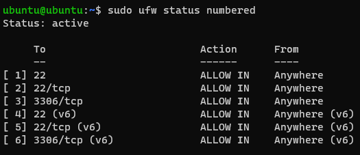 $ sudo ufw status numbered๋ฅผ ์ฌ์ฉํ๋ฉด ๋ฐฉํ๋ฒฝ ์ ์ฉ ์์์ ๋ง์ถฐ status๋ฅผ ํ์ธํ ์๋ ์์ต๋๋ค.