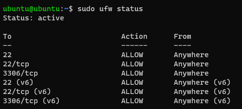 ufw ๋ฐฉํ๋ฒฝ์ ํ์ฑํํ๊ณ ๋ค์ status๋ฅผ ์กฐํํ๋ฉด active ์ํ๋ก ๋ณ๊ฒฝ๋ ๊ฒ์ ํ์ธํ ์ ์์ผ๋ฉฐ, ์๋์ ๊ฐ์ด ๊ธฐ์กด์ ์คํํ๋ ์๋น์ค๋ค์ ๋ํ IPv4 ๋ฐ IPv6์ ๋ํ ๋ฐฉํ๋ฒฝ ํ์ฉ ์ ์ฑ