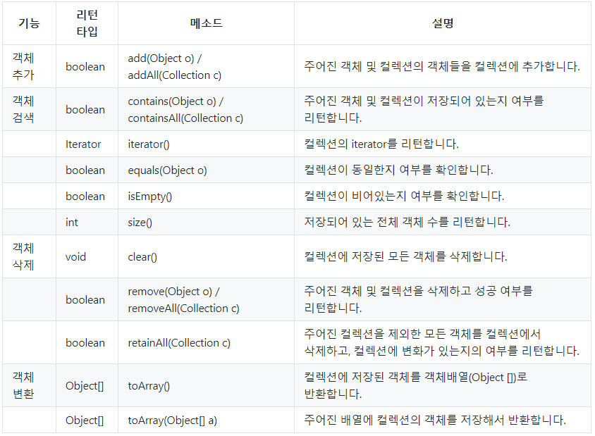 콜렉션 인터페이스에는 다양한 메서드들이 정의되어있다.