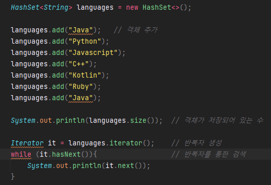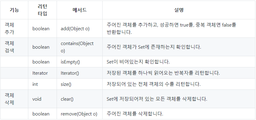 Set은 중복요소를 허락하지 않고, 저장 순서를 유지하지 않는 컬렉션입니다.