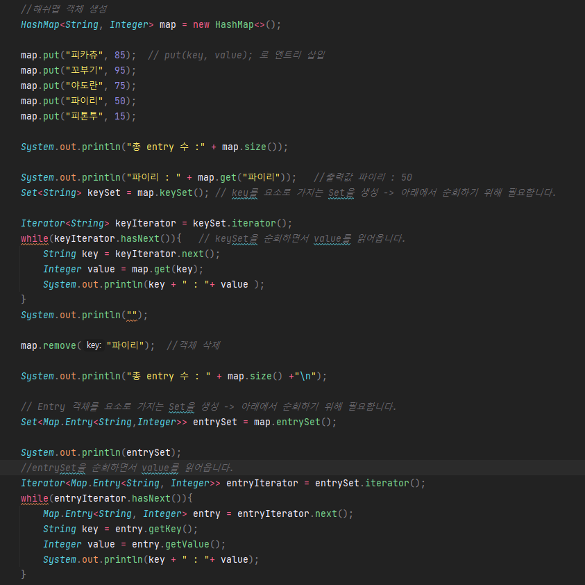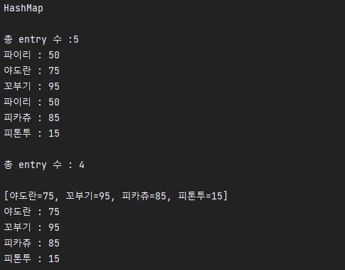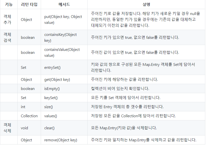 다음은 Map 인터페이스를 구현한 클래스들에서 공통적으로 사용 가능한 메서드입니다.