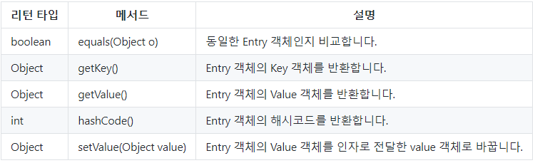또한, HashMap의 개별 요소가 되는 Entry 객체는 Map 인터페이스의 내부 인터페이스인 Entry 인터페이스를 구현하며, Map.Entry 인터페이스에는 다음과 같은 메서드가 정의되어져 있습니다.
