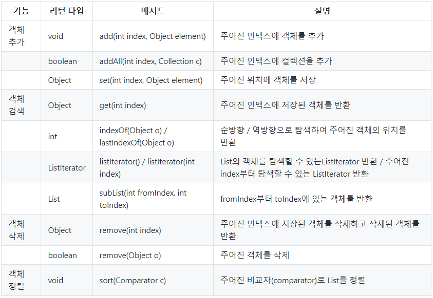 List 인터페이스에서 공통적으로 사용 가능한 메서드 들입니다. 더 많은 메서드가 존재합니다.