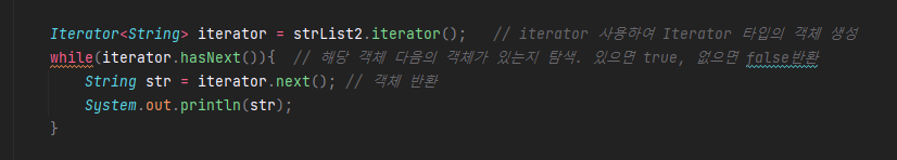 즉, 콜렉션타입의 리스트에 iterator()를 사용하여 iterator 타입의 인스턴스를 얻을 수 있습니다.