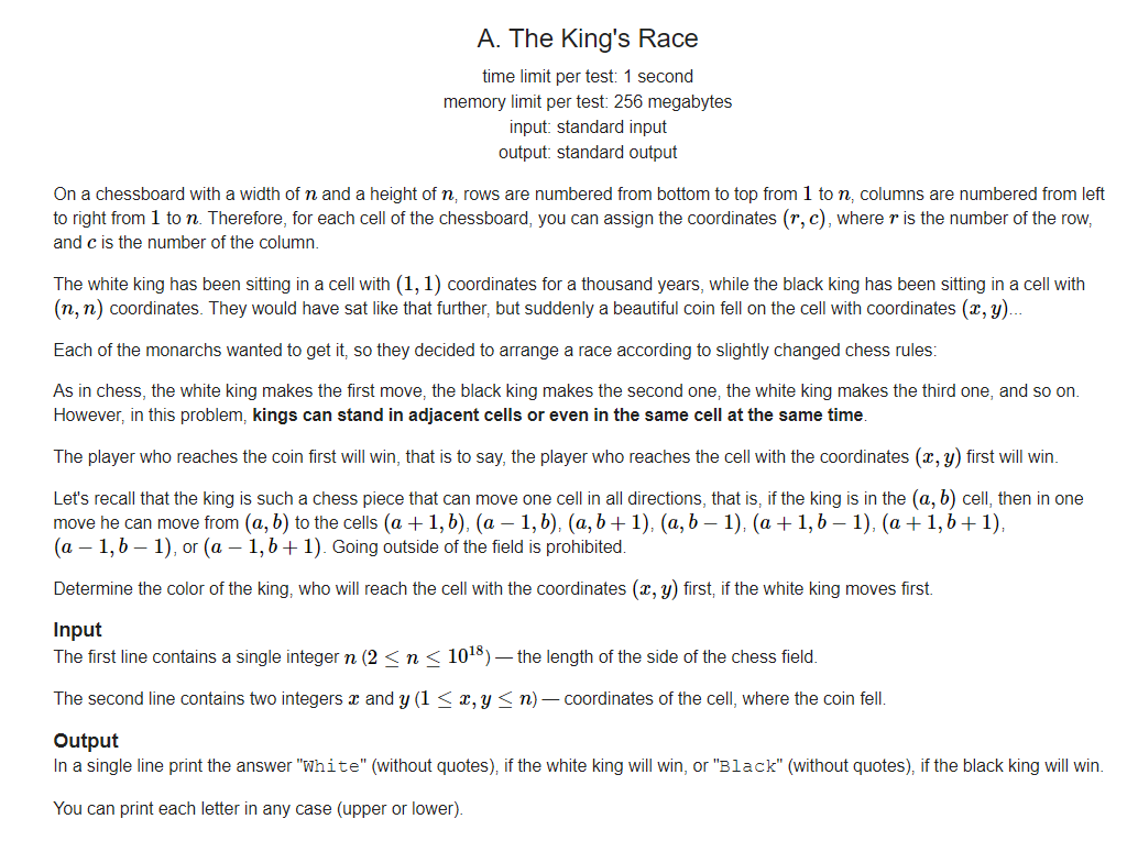따라서 코인과 가까운 왕이 승리하고 흰 색이 먼저 움직인다는 것을 감안하여 거리과 같을 경우 흰 색이 승리한다는 조건을 건다.