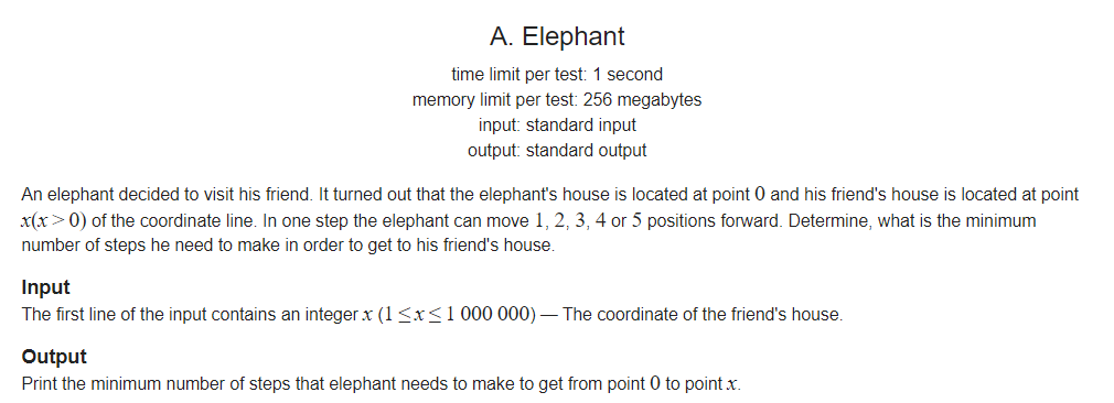 코끼리는 그의 친구에게 방문하기로 결정했다. 코끼리 집은 좌표 선 0포인트 위에 있고 그의 친구 집은 x(x>0)포인트 위에있다. 한걸을마다 코끼리는 1,2,3,4 또는 5 포인트씩 앞으로 움직일 수 있다. 결정해라, 그가 그의 친구집에 가기위해 필요한 걸음 수의 최소값을.