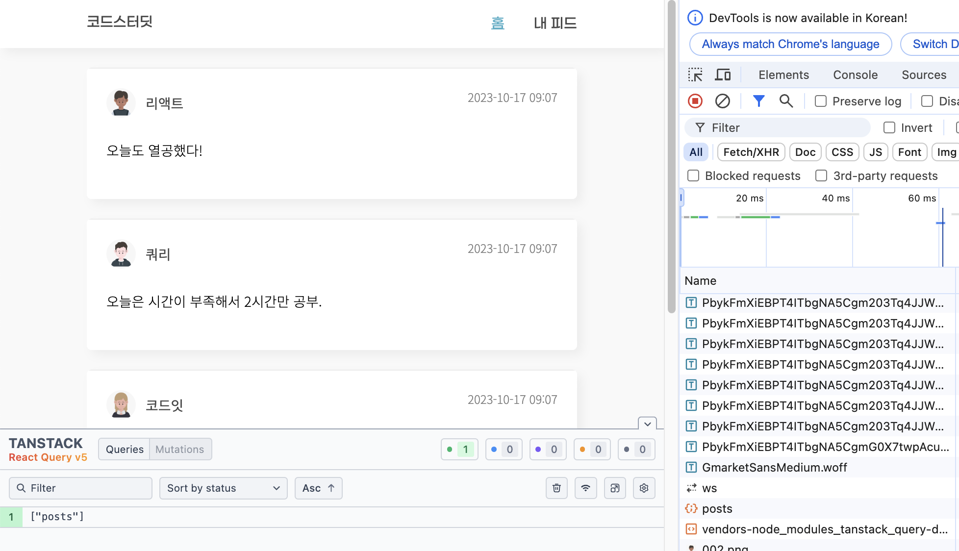 아직 제대로 사용하고 활용하지 못한 부분이라 조금 아쉽다. 이론 공부만 한 느낌이랄까... 빨리 프로젝트에 적용시켜보고 싶다. 간단한 데이터만 리액트 쿼리를 적용해보면 좋을 것 같다. 리액트 쿼리를 좀더 공부해봐야겠다.
