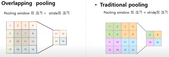 마지막으로, Overlapping Pooling입니다. Traditional Pooling의 경우, Pooling window의 크기와 stride의 크기가 같아 겹치지 않고 2칸씩 줄였습니다. 하지만 Overlapping의 경우, Pooling window의 크기가 stride의 크기보다 크도록 하여 1~3, 2~4과 같이 겹치게 구현하였습니다. 두 방식 모두 나오는 output 크기는 같지만 overfitting이 덜 되고 Top5 error는 0.3%, Top1 error는 0.4%까지 줄일 수 있었습니다.