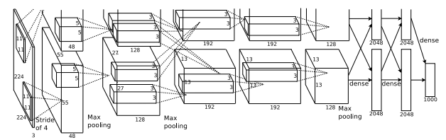 구조도를 보면 위의 그림과 같습니다. 논문과 위의 그림을 보면 input image가 224라고 되어 있는데 224로 계산을 하면 다음 사이즈가 55가 나오지 않습니다. 이는 잘못 표기된 것이고 227이 맞습니다.