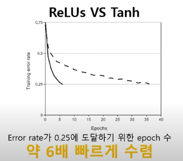 구조에 대해 살펴보면 기여를 많이 한 순서로 4가지를 소개합니다. 첫 번째는, ReLU 함수입니다. 이 논문 이전에는 대부분이 tanh 또는 sigmoid와 같은 활성화 함수를 사용하였습니다. ReLU를 간략히 소개하자면 0 이전에는 쭉 0이다가 0 이후부터 max(0,x)가 되는 함수입니다. 위 그림을 보면 실선이 ReLU, 점선이 tanh를 나타냅니다. 위 그림과 같이 ReLU를 사용하여 error가 0.25에 도달하는데 6배 빠르게 수렴한 것을 볼 수 있습니다(정규화하지 않은 CIFAR-10 데이터셋을 사용, 학습률은 각자 최적으로 사용).