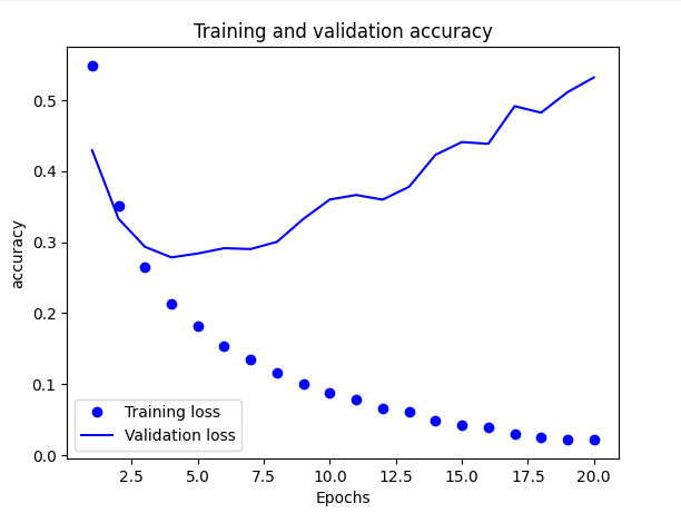 acc = history_dict["accuracy"]: 모델이 학습한 학습 데이터에 대한 정확도 값을 acc 변수에 저장합니다.