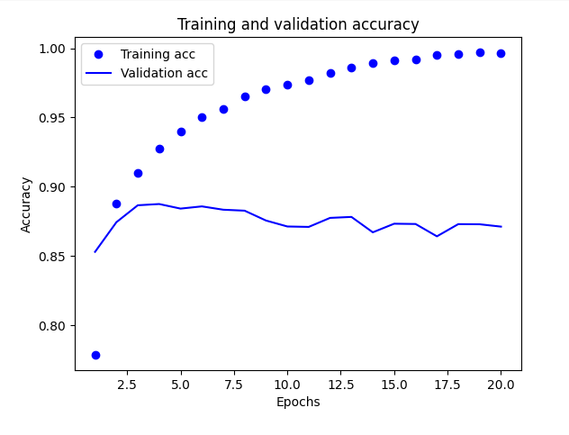 plt.plot(epochs, acc, "bo", label="Training acc"): epochs와 acc 값을 이용해 학습 데이터에 대한 정확도 그래프를 그립니다. 'bo'는 파란색 동그라미를 의미합니다. label="Training acc"는 이 그래프가 학습 데이터에 대한 정확도 그래프임을 나타내는 레이블(label)입니다.
