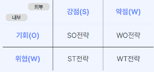 - 강점Strengths , 약점Weaknesses , 기회 Opportunities , 위협 Threats