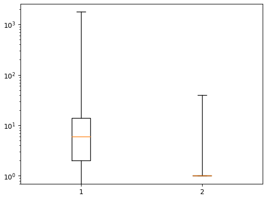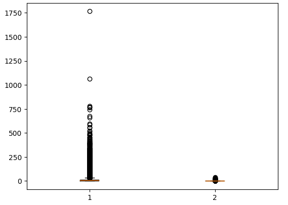 plt.boxplot(ns_book7[['대출건수','도서권수']], whis=10)