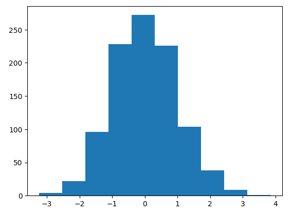 맷플롯립으로 히스토그램을 그릴 때는 hist() 함수를 사용한다. hist() 함수는 1차원 데이터를 입력받아 히스토그램을 그리며, 기본적으로 데이터를 10개의 구간으로 나눈다.