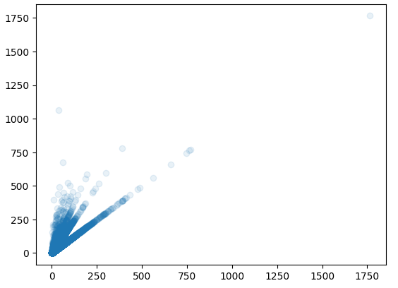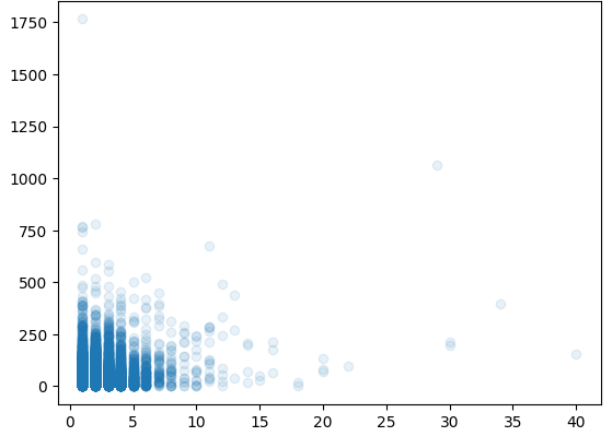 예상대로 왼쪽 아래 모서리 근처에 중첩된 데이터 포인트가 많다. 투명도를 더 낮추더라도 왼쪽 아래 모서리 근처는 여전히 짙게 나타나는데, 이는 대부분의 도서권수가 적다는 것을 의미한다.