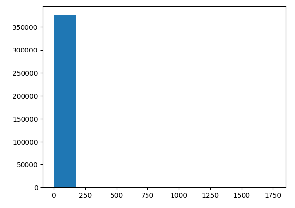 산점도에서 보았듯이 대부분 도서의 대출건수는 작다. 따라서 앞의 그림과 같이 첫 번째 구간의 도수가 너무 커서 다른 구간에는 도수 값이 표시되지 않는 현상이 발생한다.