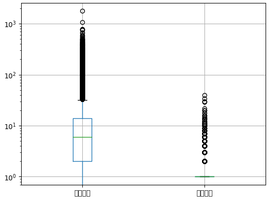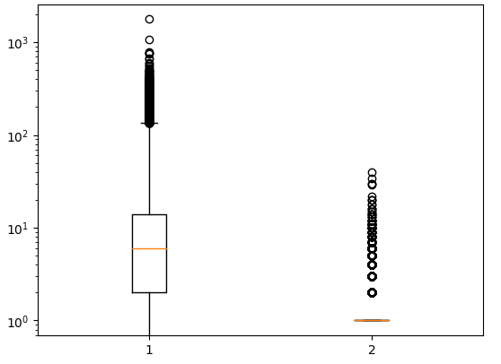 y축을 로그 스케일로 바꾸어도 2번 상자(도서권수)는 여전히 보이지 않지만, 1번 상자(대출건수)는 상자 모양을 뚜렷하게 확인할 수 있다. 사실 '도서권수' 열의 사분위수는 모두 1이기 때문에 상자가 보이지 않는 것이 맞다!