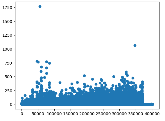 이번에는 남산도서관 대출 데이터를 사용해 산점도를 그려보자. 맷플롯립은 폋ㄴ리하게도 x축과 y축 값으로 데이터프레임의 열을 입력받을 수 있다. 남산도서관 대출 데이터 중에서 '번호' 열의 값을 x축에 넣고 '대출건수' 열의 값을 y축에 넣어보자.