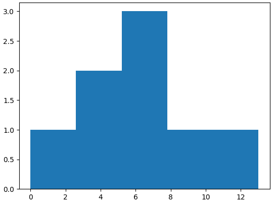 간단한 샘플 데이터로 히스토그램을 어떻게 그리는지 알아보자. 8개의 정수로 이루어진 간단한 데이터를 사용한다. bins 매개변수를 5로 지정하여 5개의 구간으로 그려보자.