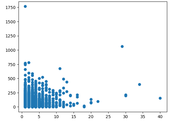 그럼 '번호' 열 말고 '도서권수'와 '대출건수' 열의 산점도를 살펴보자. 이전과 마찬가지로 scatter() 함수의 첫 번째 매개변수에는 x축에 해당하는 '도서권수' 열을 지정하고, 두 번째 매개변수에는 y축에 해당하는 '대출건수' 열을 지정한다.