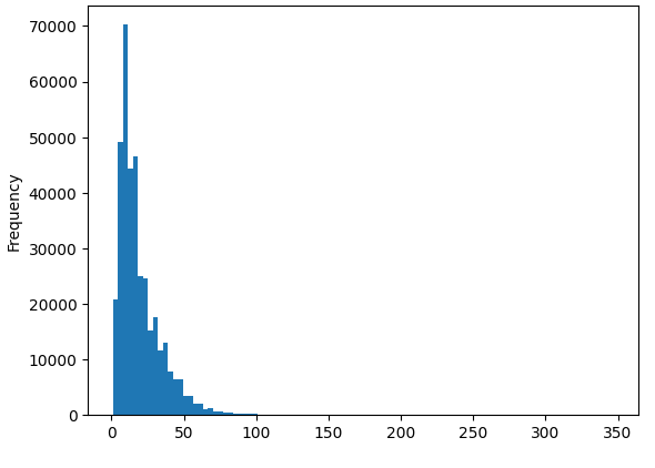 이번에는 x축의 구간을 더 세세하게 나누어보자! hist() 함수는 기본 10개의 구간을 사용한다. bins 매개변수에서 이를 100으로 바꾸면 데이터 분포를 조금 더 세밀하게 관찰할 수 있다.