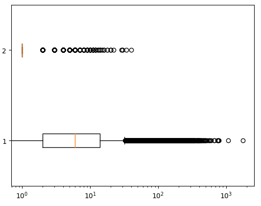 수평으로 그려야할 경우, boxplot() 함수의 vert 매개변수를 기본값 True에서 False로 바꾸면 된다. x-y축이 바뀌므로 로그 스케일도 x축에 지정해야 한다 히스토그램과 마찬가지로 xscale() 함수를 사용한다.