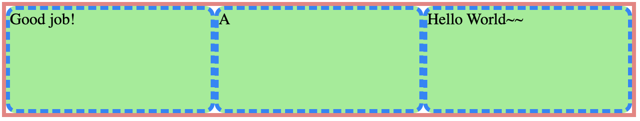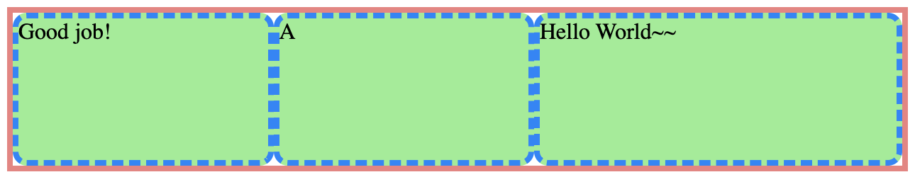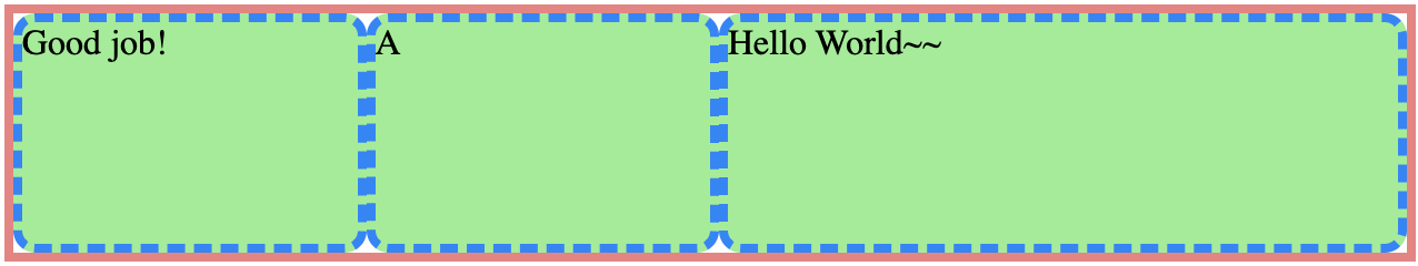 <style> .container { border: 4px solid lightcoral; display: flex; } .container .item { height: 100px; border: 4px dashed rgb(11, 131, 251); background-color: lightgreen; border-radius: 10px; flex-grow: 1; } </style> <body> <div class="container"> <div class="item item1">Good job!</div> <div class="item item2">A</div> <div class="item item3">Hello World~~</div> </div> </body>