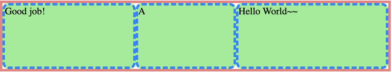 <style> .container { border: 4px solid lightcoral; display: flex; } .container .item { height: 100px; border: 4px dashed rgb(11, 131, 251); background-color: lightgreen; border-radius: 10px; flex-grow: 1; flex-basis: 0; } </style> <body> <div class="container"> <div class="item item1">Good job!</div> <div class="item item2">A</div> <div class="item item3">Hello World~~</div> </div> </body>