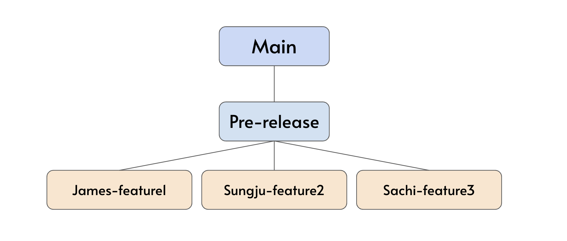 Let's assume that we plan to have our branch built like the below image where the highest level of branch besides the main is the 'pre-release' branch. Such branch is made to reduce the possibility of any problematic code to get pushed to the main branch.