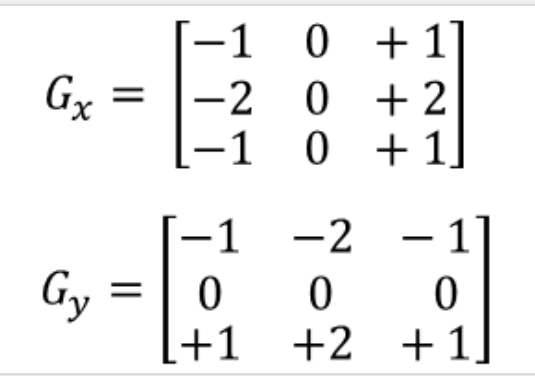 3x3 matrix로 연산하였을 때 중심을 기준으로 각 방향의 앞뒤를 비교하여 변화량을 검출한다. 소벨 필터는 중심 픽셀의 차분 비중을 두 배로 주어 x축, y축, 대각선 방향의 경계 검출에 모두 강한 특징을 가지고 있다.