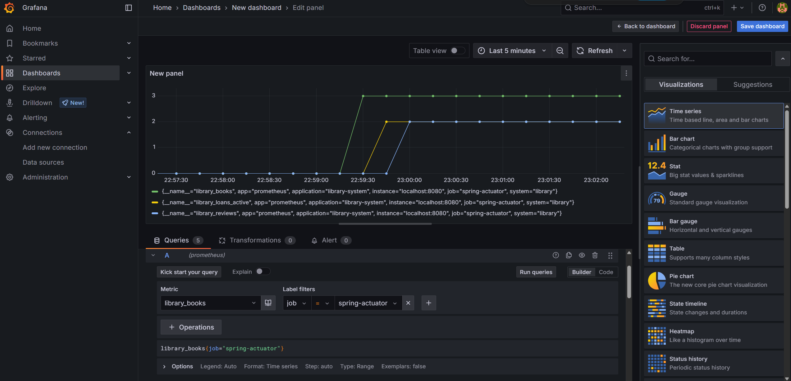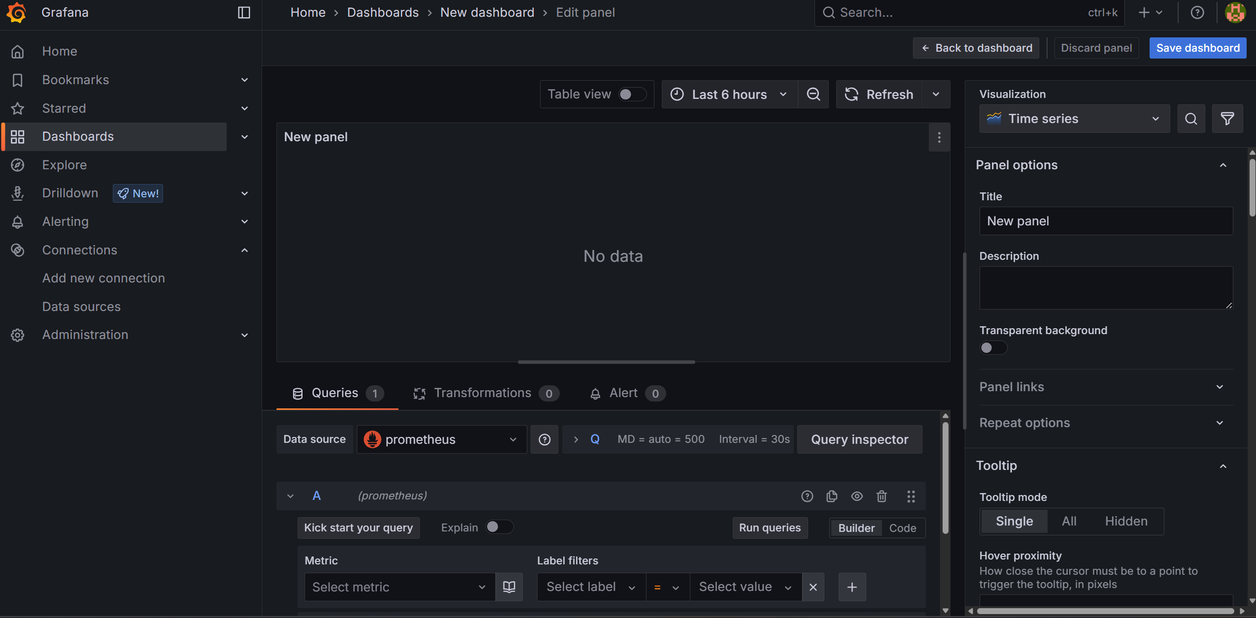 Dashboards -> Create dashboard -> Add visualization 을 한 뒤, 프로메테우스를 선택 하면 아래와 같은 화면을 볼 수 있다.
