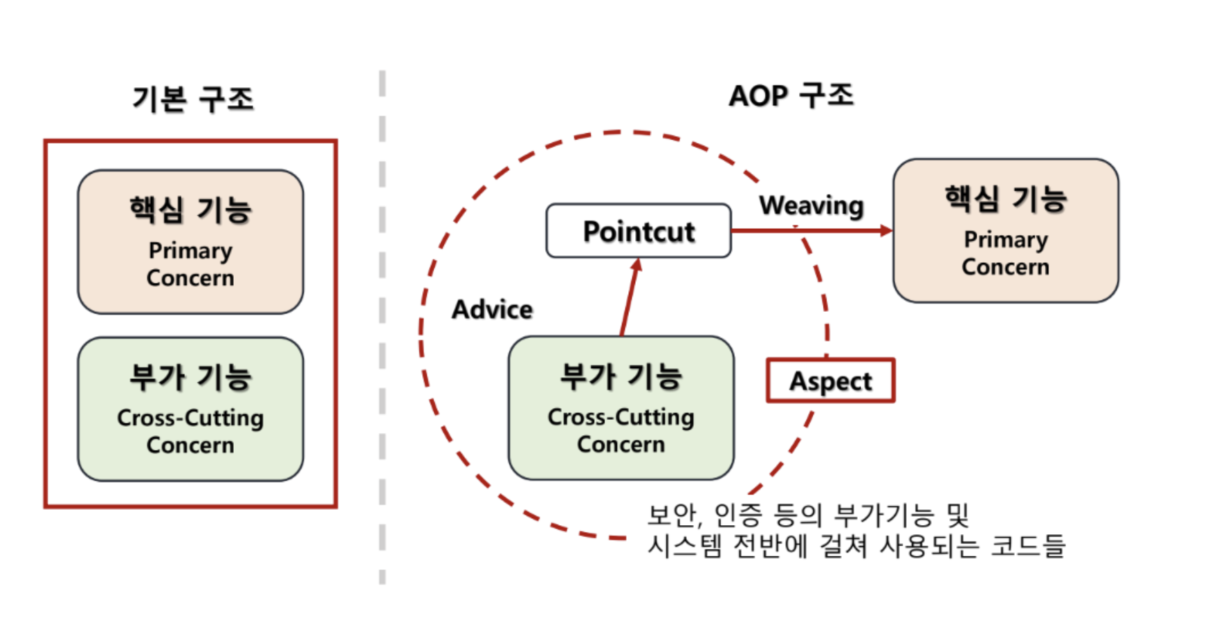 | Aspect | 공통 관심사를 모듈화한 것. 로깅, 트랜잭션, 보안 등 |